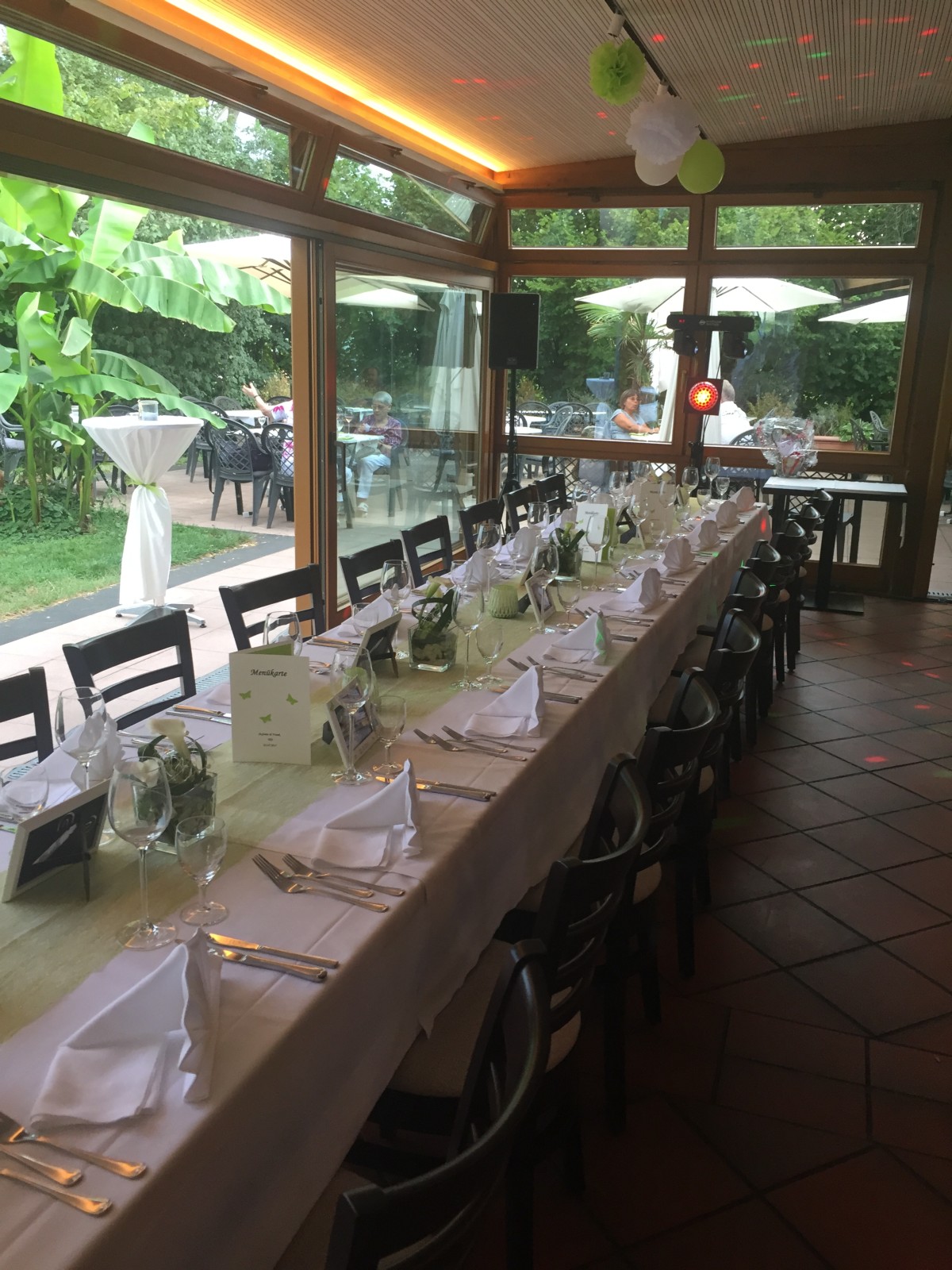 Wir bieten Platz für bis zu 60 Personen für Familienfeiern und andere Anlässe in unserem schönen Wintergarten.